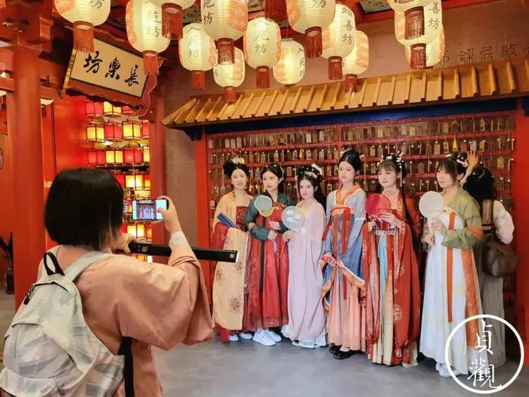 长安十二时辰街区,游客可穿着唐装行走于街区之中。在上述政策的倾斜和推动下,陕西省推出了一系列“活化”文物资源的案例和IP,其中不乏火爆出圈的大唐不夜城“不倒翁小姐姐”和华清宫文化旅游公司推出的大型历史实景舞剧“长恨歌”。