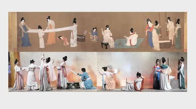 戏演壁画捣练图。在“不倒翁小姐姐”皮卡晨爆火后,大唐不夜城又相继推出了一系列广受好评的新节目,例如唐风舞蹈表演《戏演壁画》则活化了张萱的《捣练图》,舞剧服化道精美,高度还原了古画中的场景,此外更是脑洞大开,将《捣练图》编排成了一个巧思满满的舞台故事,使观众身临其境。