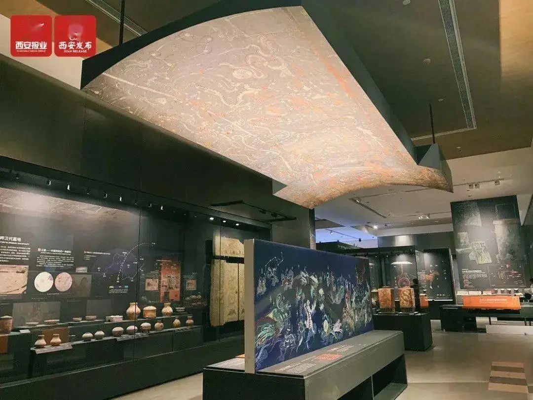陕西考古博物馆展厅内部。而回到陕西考古博物馆,它作为活化陕西文物资源的代表,的确在知识传播和教育普及上做出了尝试和努力。在展陈中,馆方反复使用了场景复原、模型沙盘、半景画、绘画、仿真雕塑和科技装置等手段。例如在 “文保科技”篇中,为了还原蒲城洞耳村元代壁画墓的八边形穹窿顶,展陈人员做了多套设计方案,最终决定采用整体场景还原的方式,把壁画墓抬升至3米高处,观众可从底部仰望的特殊观看方式。在此基础上,馆方还融合了数字多媒体3DMapping技术,演绎了墓主人生前“堂中对坐图”“临行献酒壮行图”“醉归乐舞图”“停舆图”“放牧图”等生活场景,让观众更直观了解展品背后的文保科技手段和文化内涵。然而,这些展陈手段不免仍有新瓶装旧酒的感觉,展陈手段的形式意义大于对内容阐释的作用,没有专业知识背景的观众在消化如此专业的内容时仍会感到力不从心。若知识传播和教育普及是文物工作的终点站,尚有最后一站地、最后一公里,有待文博、文旅人去探索。