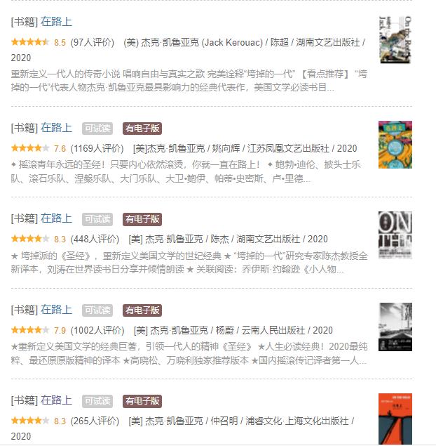 2020年,《在路上》刚进入“公版”市场的前两个月,我国就迅速出现了十几个版本。
