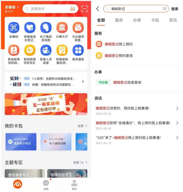 1、在“皖事通”APP首页搜索框中搜索“婚姻登记网上预约”进入服务。