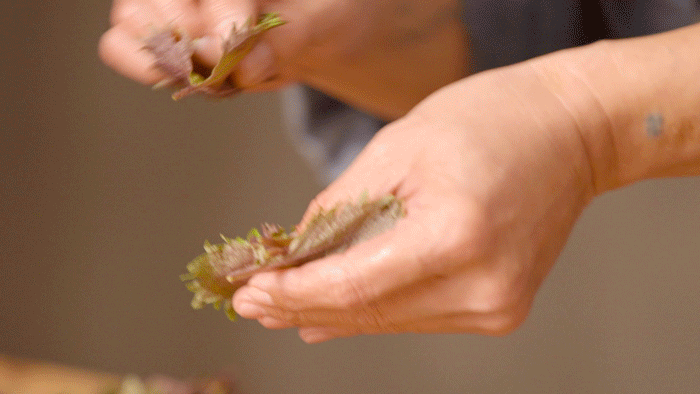 处理紫苏尽可以粗放些,洗净之后叠起来卷一下,切上两刀就可以了。