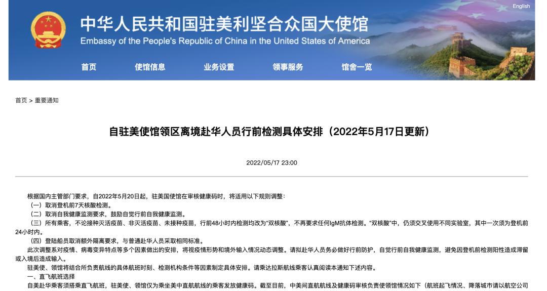 5月17日晚,中国驻美国大使馆发出通知,自5月20日起,回国航班登机,取消提前7天核酸检测要求,取消抗体检测要求,取消自我隔离检测要求,只需要48小时双核酸检测即可。