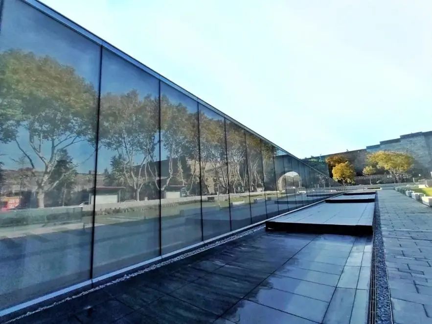 其造型灵感来源于中华门瓮城两侧的马道,馆体高低错落,动态感十足~周边的古城美景投射在馆外的玻璃幕墙上,更是给博物馆外观增添了几分艺术性。