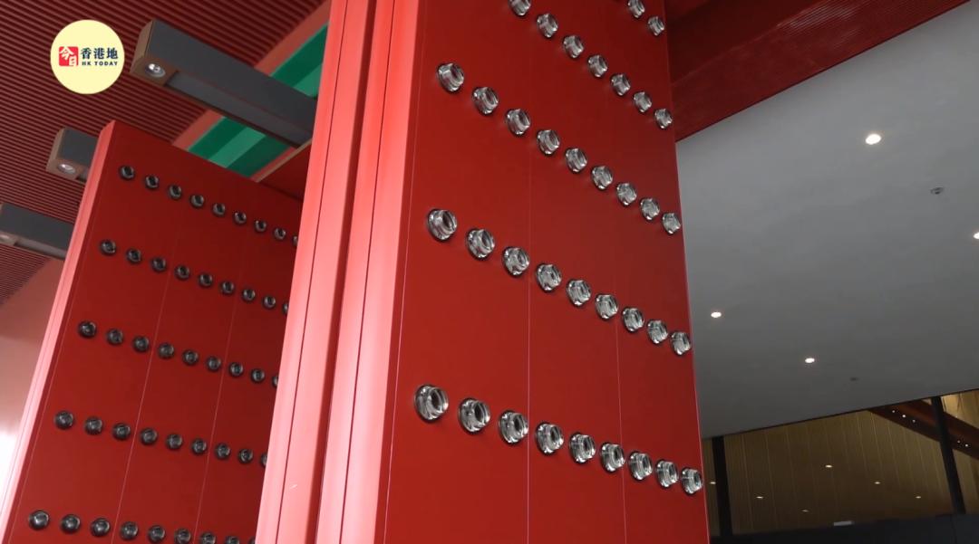 香港故宫占地约1.3万平方米,楼高7层,整体看来,“故宫味儿”非常浓,比如博物馆建筑以故宫的主色调米金色为主,正门入口红色大门上的玻璃门钉也是参照了北京故宫的门钉装饰,大堂中庭的金色天花则参照了故宫屋顶的琉璃瓦设计……