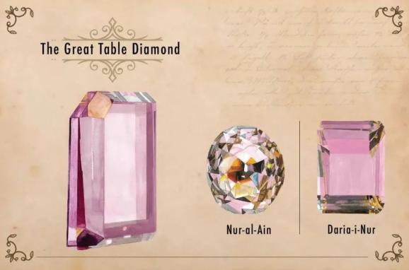 法拉赫·蒂巴,伊朗皇后那是一颗名为大桌钻石的巨大粉钻。据记载,大桌钻石形如一张长方形的台面,重量至少超过250克拉,是世界上有历史记录的最大的天然粉钻。