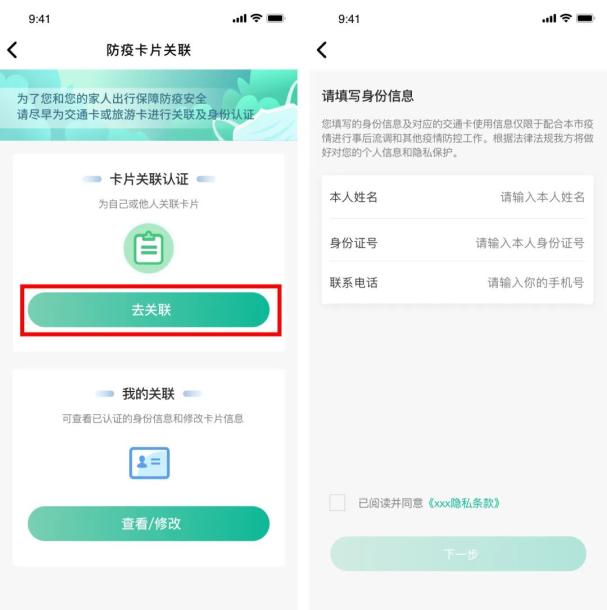 2.选择【本人】去“关联卡片”,登记本人使用的交通卡号并成功提交。