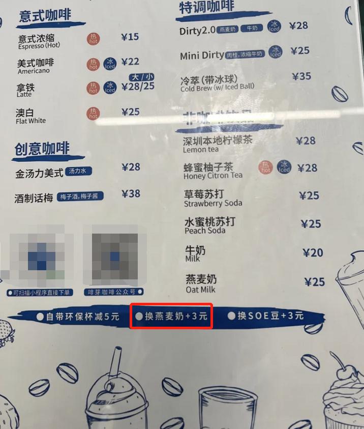 咖啡店菜单上写着“换燕麦奶+3元”丨拍摄 樊北溟