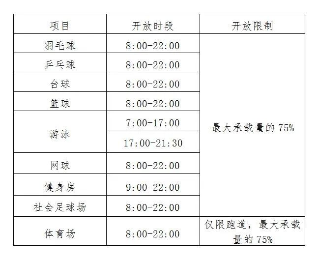根据南昌市体育局发布的洪体发〔2022〕38号文件关于印发《南昌市体育场馆复工防控指南》的通知规定,体育场地设施要严格控制入场人员,按照最大顾客承载量的75%实行错峰开放,不得造成人员聚集。南昌国际体育中心按照文件要求定于5月24日进一步有序对外开放。具体开放情况如下: