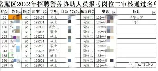 据长沙市岳麓区于5月21日中午12点公布的《岳麓区2022年招聘警务协助人员报考审核通过名单公告》显示,在通过“警务协助人员岗位二”审核的人员表格中,出现了众多本科硕士人员,其中最高学历为一位1994年出生的张姓女博士(特长备注为“清华大学”),另有研究生10人,本科349人。
