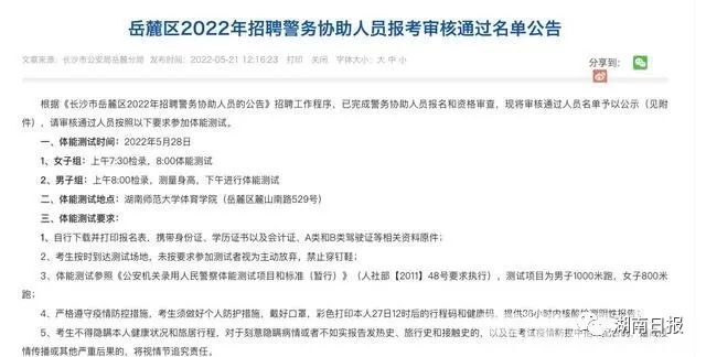 公告显示,名单中人员已完成警务协助人员报名和资格审查,将按照要求参加体能测试。