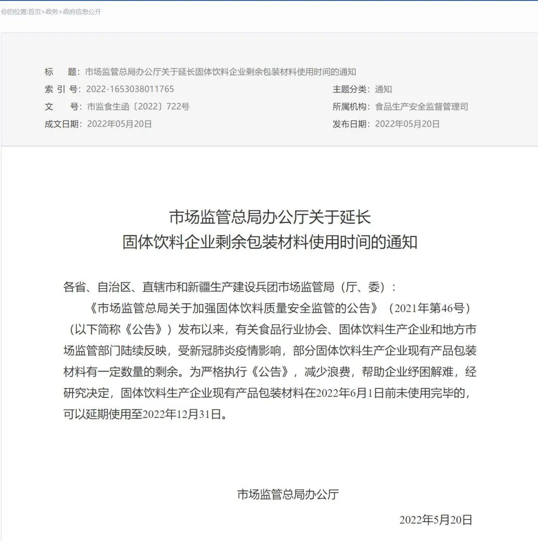为严格执行《公告》,减少浪费,帮助企业纾困解难,经研究决定,固体饮料生产企业现有产品包装材料在2022年6月1日前未使用完毕的,可以延期使用至2022年12月31日。