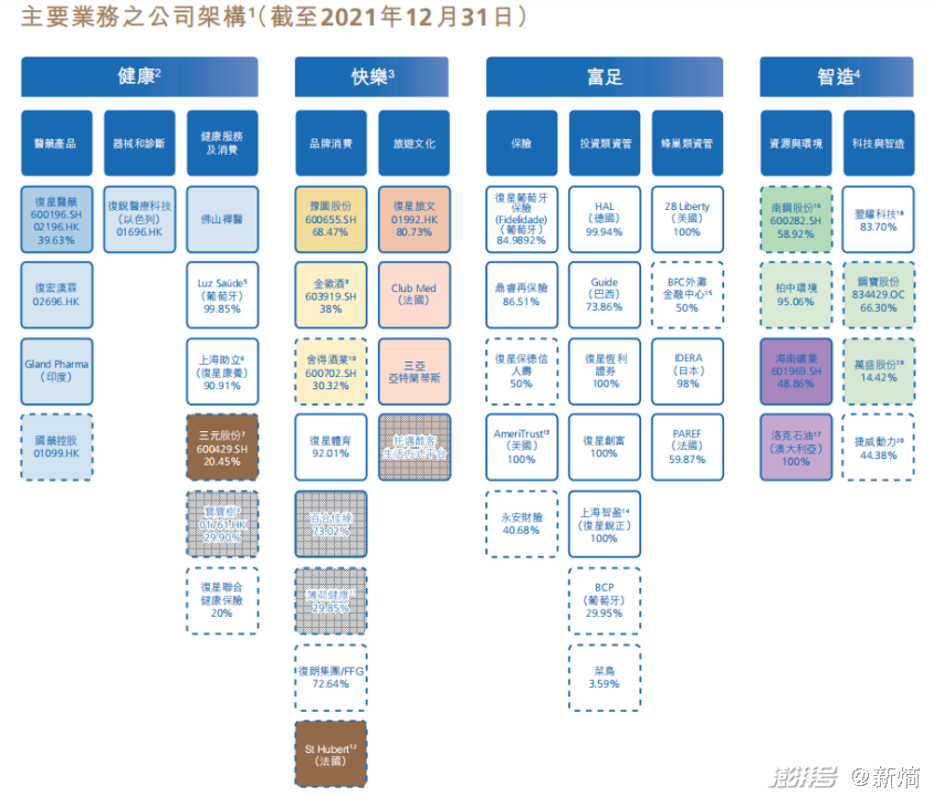 这一策略使复星国际成长为庞大的控股型企业。截至2021年末,复星国际已经拥有健康、快乐、富足、智造四大板块的数十家企业布局,资产总规模超过8000亿元,年度营收总额超过1600亿元。