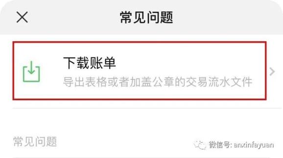 4.在账单功能界面,点击顶部的“常见问题”按钮,该界面出现“下载账单”功能,点击该功能,进入账单下载界面