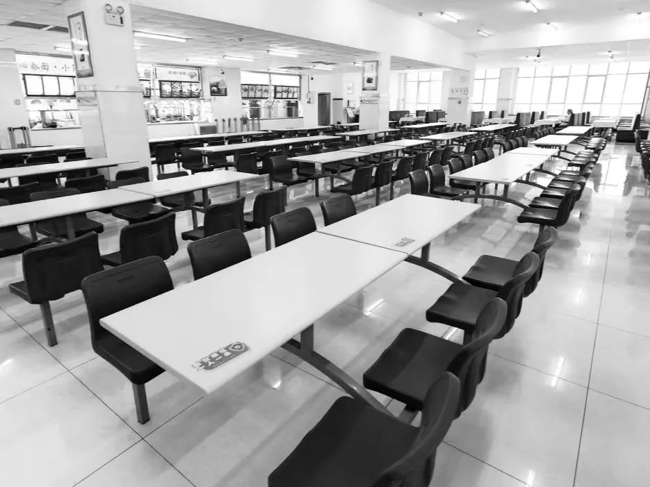 伴随着美味的佳肴,食堂在排成排的蓝色椅子衬托下,显得格外干净。学子们每天都在这里享受着一日三餐,对蓝色的记忆也都藏在这里。