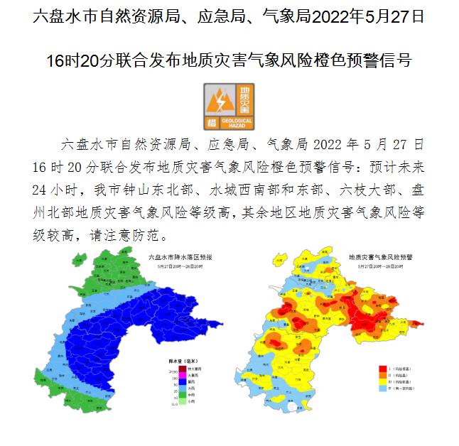 六盘水市自然资源局、应急局、气象局2022年5月27日16时20分联合发布地质灾害气象风险橙色预警信号
