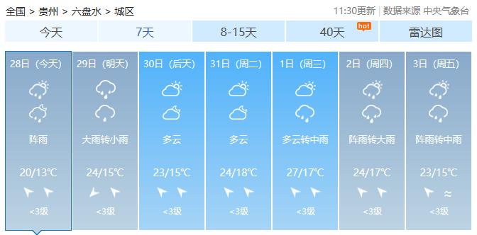 28日白天,全省各地阴天有阵雨或雷雨,西部、南部地区有中到大雨,其中毕节市南部、六盘水市中东部、安顺市、黔西南州东北部、黔南州西部和南部的边缘地区局地有暴雨,个别乡镇有大暴雨。