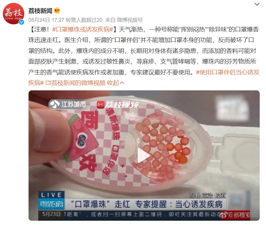 据了解,不管是口罩爆香珠还是口罩香薰贴,它们的主要成分为藿香、薄荷、明胶、甘油以及一些不明香料。如果爆香珠浸湿口罩,会破坏口罩的结构,导致口罩失去其本身的防护作用。