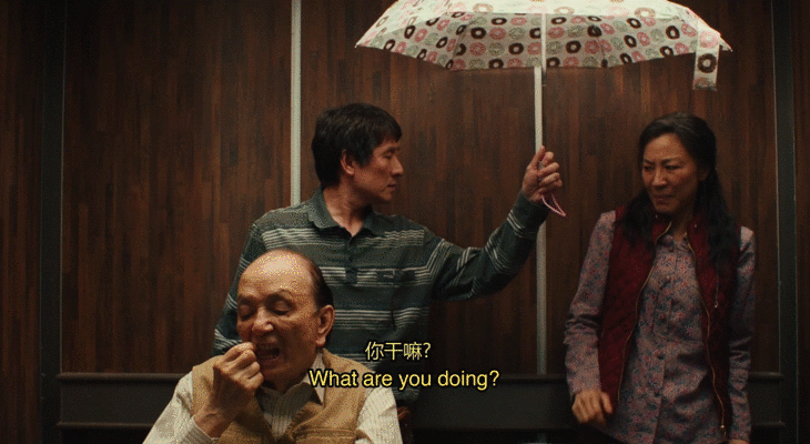 在平行宇宙中穿行时,伊芙琳看到了人生的1000种可能,这也是这部电影大放异彩、百无禁忌的时刻。她可以是杨紫琼本人,没有和韦蒙结婚,成了香港的武打明星,走上戛纳红毯。