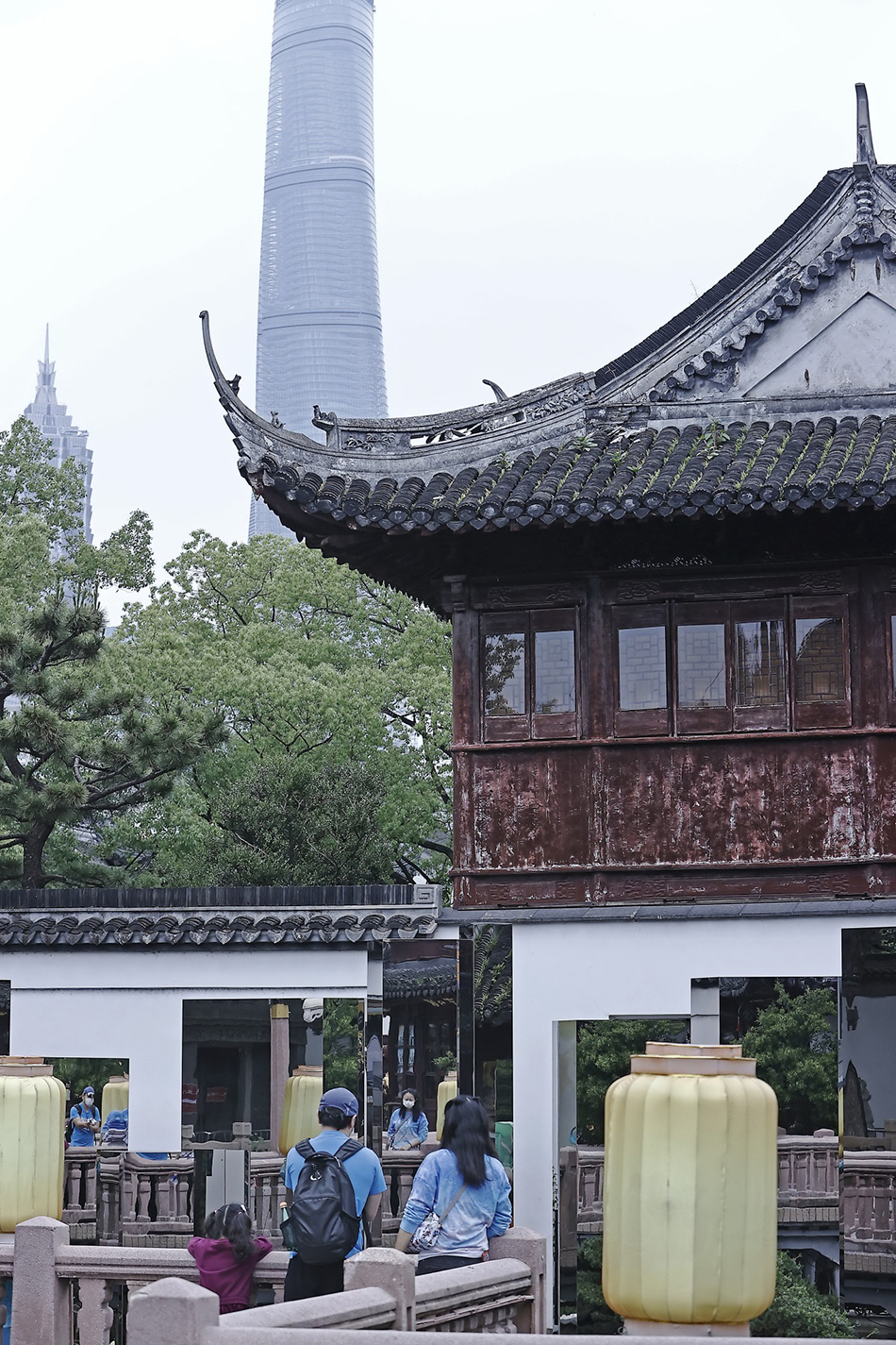 2022年5月28日,上海豫园,市民带着孩子在九曲桥上欣赏园艺景观。中新社记者殷立勤/澎湃影像 图