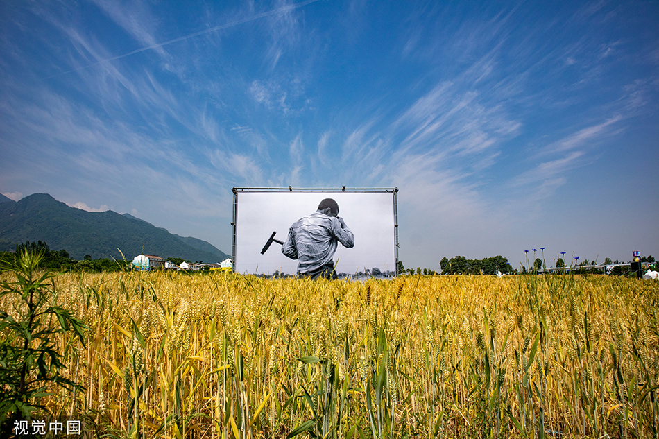 2022年5月24日,《重回现场》陕西摄影群体“麦客”主题展在西安市鄠邑区举行,麦田里竖立着数幅大尺寸的黑白摄影作品。这些都是上世纪80、90年代陕西摄影群体拍摄的经典的“关中麦客”形象。李晖/视觉中国 图