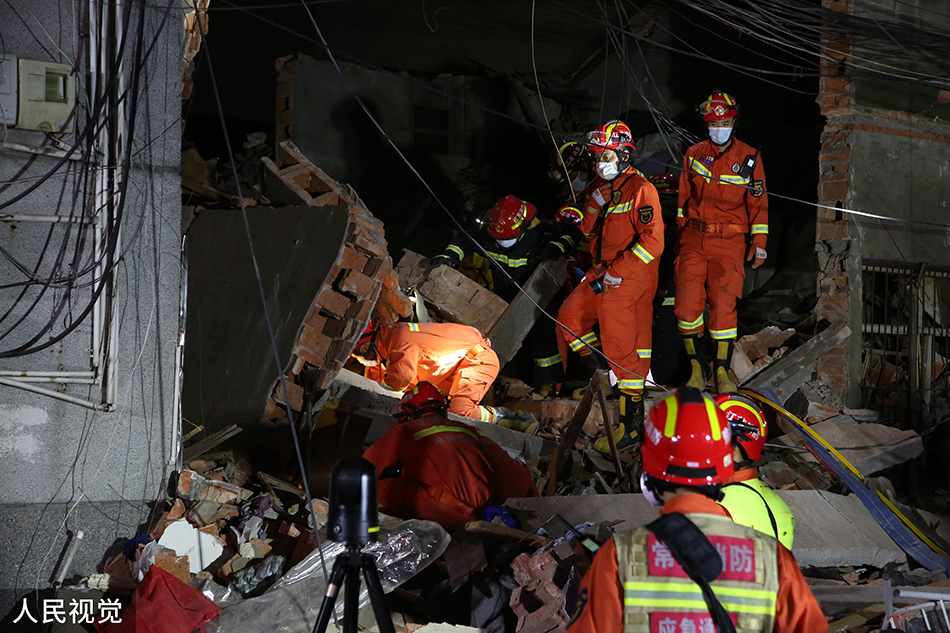 2022年5月24日晚,江苏常州,武进区湖塘花园街内发生爆炸,消防员赶赴现场。人民视觉 图