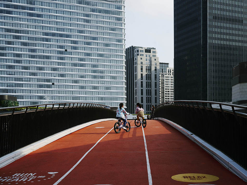 2022年5月26日,上海浦东新区,前滩太古里,两位小朋友在骑车玩耍。