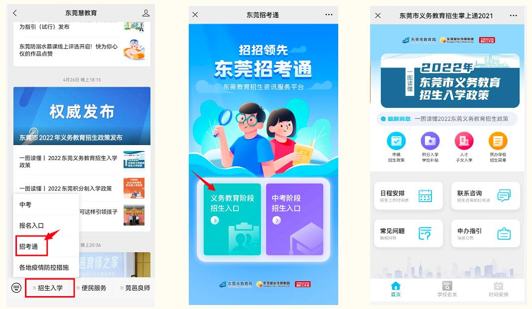 今年,市教育局继续优化升级“东莞招考通”招生资讯服务平台,家长可关注“东莞慧教育”或“东莞市教育局”微信公众号,点击菜单栏“招生入学”-“招考通”,随时随地、全面了解和掌握招生政策和招生资讯。