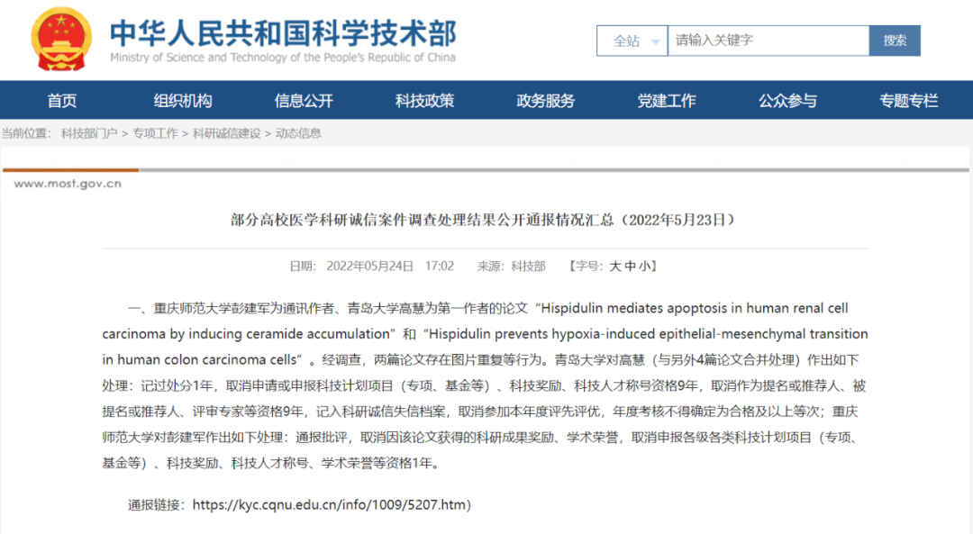 科技部通报24起部分高校医学科研诚信案件调查处理结果。主要涉及代写代投、数据和图片造假、不当署名、伪造通讯作者邮箱、买卖论文数据等行为。涉事人员受到记过处分、取消科技计划项目(专项、基金等)申报资格,取消博士学位申请资格、取消各类评奖评优及职务职称晋升申报资格、取消招收同等学力研究生资格等处罚。(中国新闻网)
