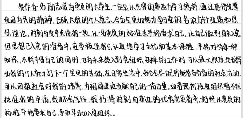 4、战“疫”中的入党申请书校园封闭管理期间,音乐学系的杨景淳、陆子涵、唐诗三位同学看到全系党员老师们不仅承担了志愿者工作,还分别与同学结对,施行党员导师制,充分发挥先锋模范作用,为青春保驾护航。当看到同寝室友穿上大白为同学们分发物资、看到在寝室驻守的辅导员老师们有些疲惫的面庞、看到同学发来与前往战“疫”一线专业课老师隔楼相望的照片……她们被那些勇敢无畏、毅然前行的人们深深地触动,表示随时准备好前往战“疫”一线,同时递交了入党申请书。