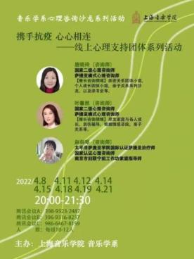5、心手相连,共克时艰——开展线上心理支持团体系列活动为了保障同学们的日常生活,缓解焦虑情绪。音乐学系共组织举办十余次线上心理支持团体活动,让同学们有机会与心理咨询师充分互动,保障特殊时期的心理健康。通过多次交流,同学们学会了如何在疫情防控期间做好自我心理调节,与他人保持良好沟通,培育理性平和、积极向上的健康心态。