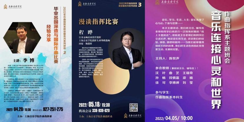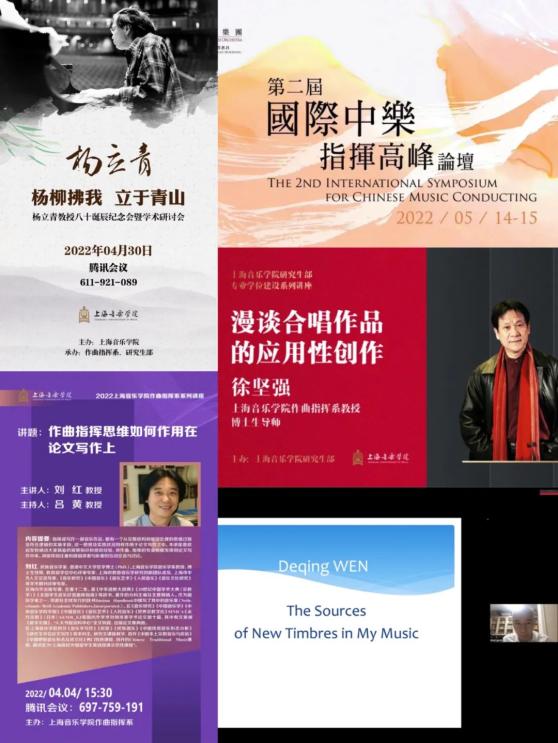4月4日,音乐学系教授刘红老师为作指系毕业班学生带来专题讲座《作曲指挥思维如何作用在论文写作上》。4月7日,作指系教授徐坚强老师为作曲方向博士、硕士开展专题讲座《“非常时期不寻常创作”——关于作曲创作灵感之谈》。4月30日,“杨柳拂我,立于青山——杨立青教授八十诞辰纪念会暨学术研讨会”与线上隆重召开。5月14-15日,张国勇、阎惠昌、叶聪、林大叶、李博禅老师参加第二届国际中乐指挥高峰论坛,透过不同主题及角度的讲座,互动交流对中乐指挥的发展愿景。