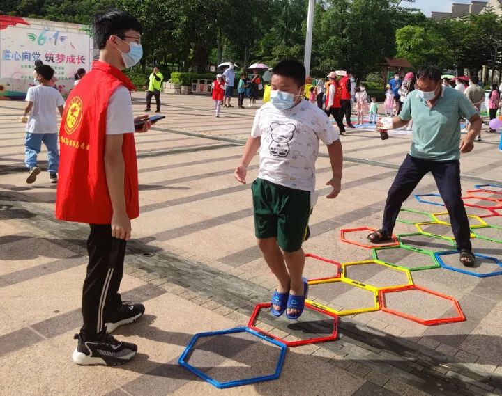 义联村,孩子在游戏里感受节日快乐。在板嶂岭社区,“童心向党,筑梦成长”欢乐嘉年华活动在板嶂岭森林公园开展。孩子们玩“炸碉堡”、垃圾分类、手脚并用、跳大绳、跳圈圈、风火轮等各种游戏。丰富有趣的游戏吸引了每个孩子,他们在家长的陪伴下,穿梭于各个游戏区,玩得不亦乐乎。