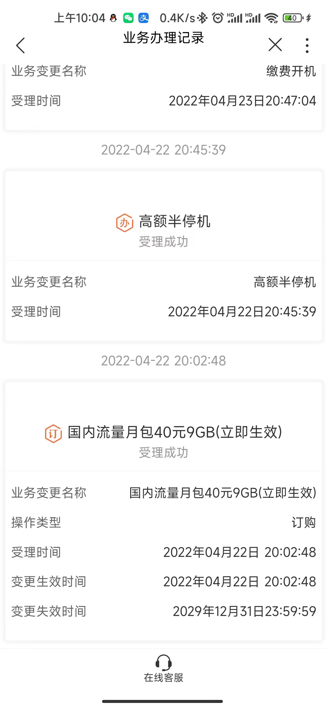 吴先生的业务办理记录显示,2022年4月22日,其账户订购了每月40元的国内流量月包9GB,该业务生效后约40分钟,账户进入高额半停机状态。