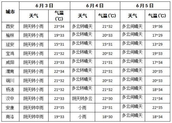 6月3日:全省多云转阴天,陕北大部、关中有小雨,陕南有小到中雨,秦岭山区、陕南南部局地大雨,关中西部、陕南西部部分地方有雷暴,局地有短时强降水、冰雹或雷暴大风等强对流天气。关中东部局地有35℃以上高温。陕北、关中北部有5~6级偏北风,阵风可达7级。日平均气温全省下降4~6℃。