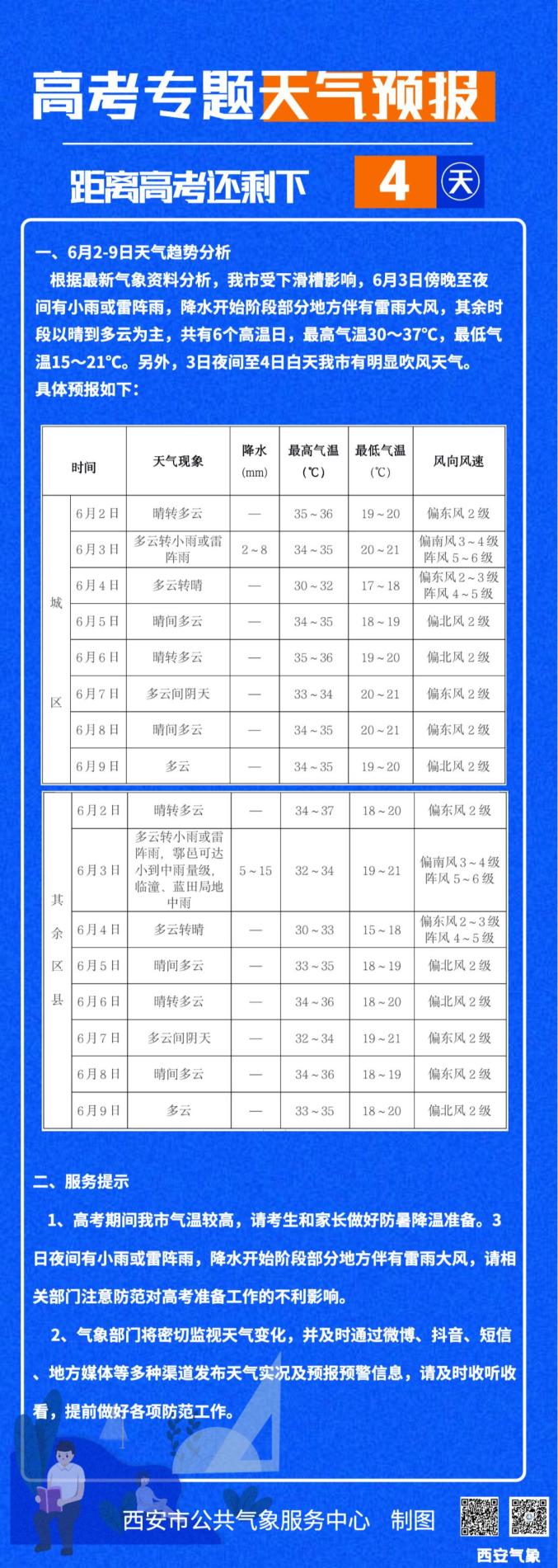 【西安气象】西安市气象台2022年6月2日16时发布“三夏”专题预报:6月3日傍晚至夜间我市有小雨或雷阵雨,降水开始阶段部分地方伴有雷雨大风。具体预报如下: