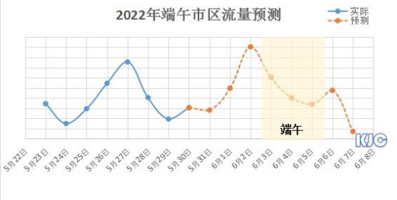 (一)市区道路流量总体增加并呈现不均衡分布。预计今年端午假期市民购物、娱乐、餐饮出行流量略高于近期周末和“五一”假期和去年同期。假期市区早高峰将推迟到9时起,晚高峰延至21:30后结束。每天交通运行趋势大体一致,但首日出行流量更高,9时起主干道及出入城道路流量增大,11时小高峰、13时回落、15时再次上升,19时高峰,21 时逐渐恢复。下图为通过建立回归模型,对假期市区通行趋势的分析情况。