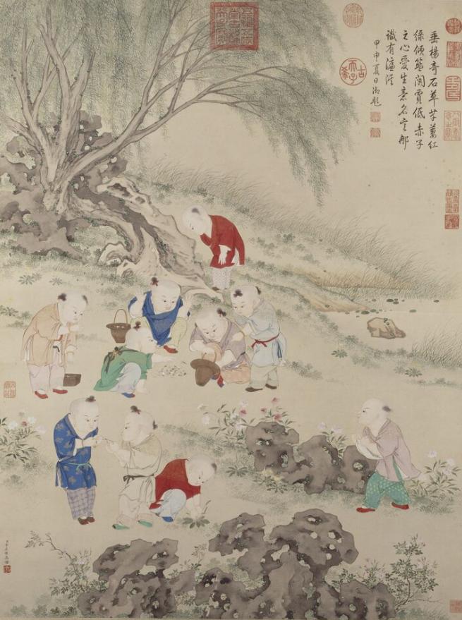 清 金廷标 《儿童斗草图》 故宫博物院藏河边缓坡上,杨柳青青,怪石嶙峋,花草丰茂。