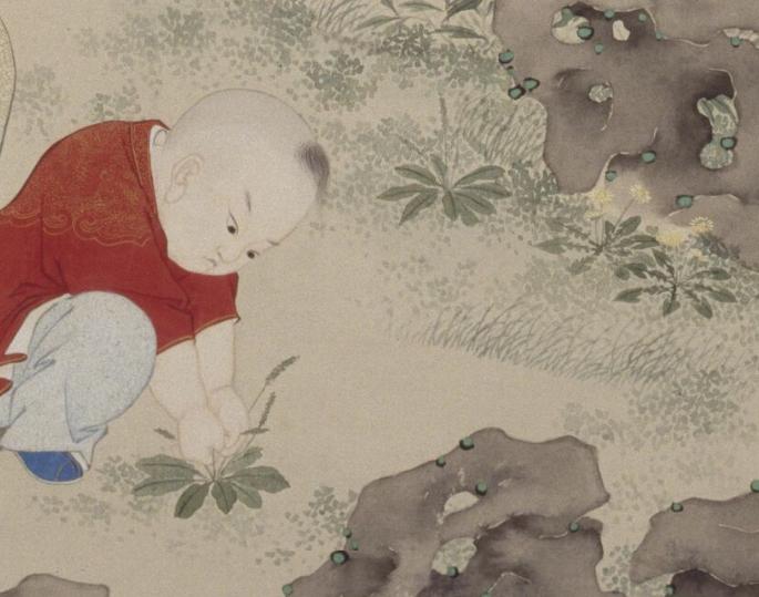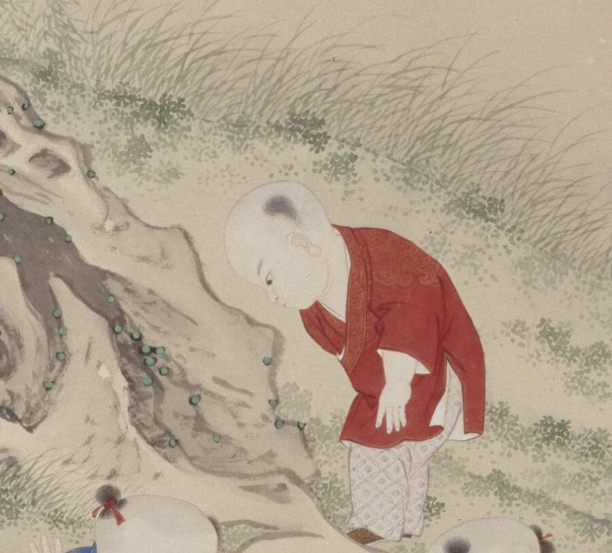 清 金廷标 《儿童斗草图》(局部) 故宫博物院藏红衫小孩神情严肃,表情认真,正弯着腰在石头缝里寻找,希望能找到别人没见过的花草,胜过其他伙伴。