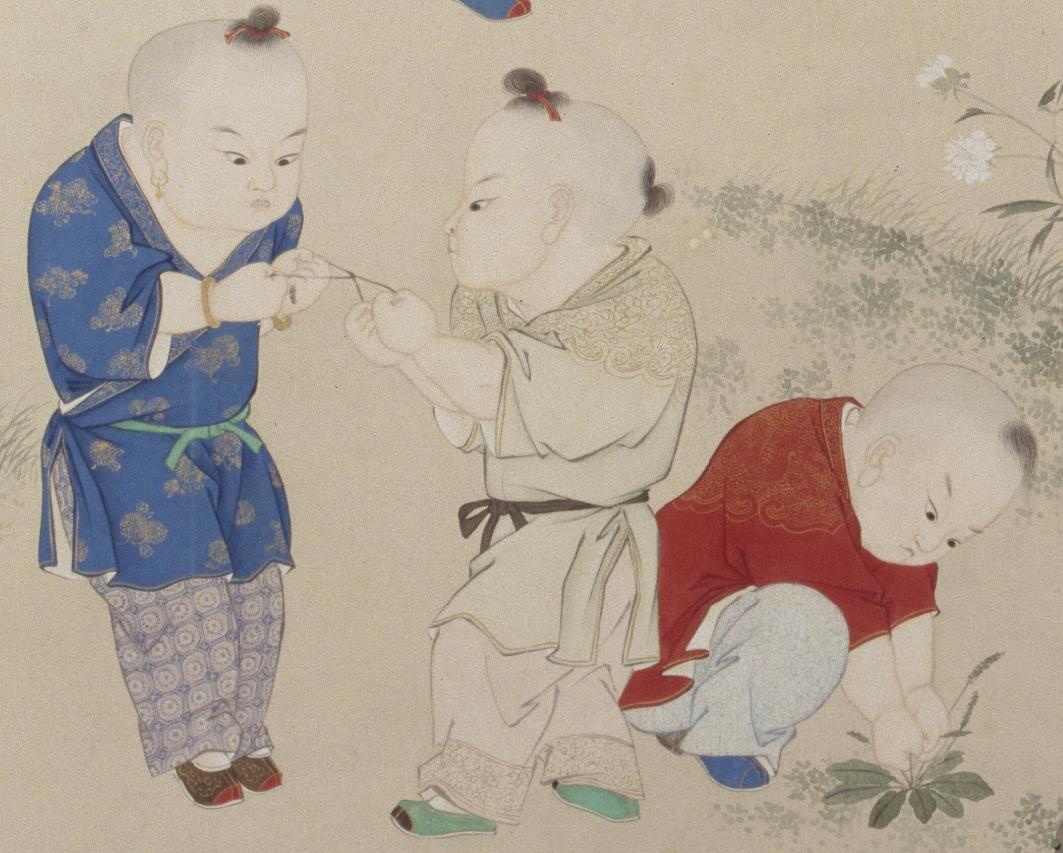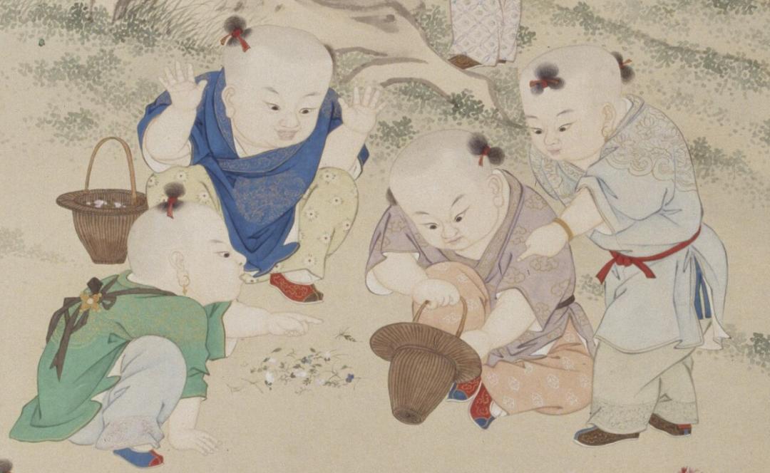 清 金廷标 《儿童斗草图》(局部) 故宫博物院藏在他身后,蓝衫、绿衫、紫衫、浅衫小童围成一圈,斗草斗得正酣。他们中间空地上堆满了花草,看样子是绿衫小孩数完了他采集到的所有花草,轮到对面的紫衫小孩。紫衫小孩坐在地上,从编制精美的小花篮里把他的花草往外掏。