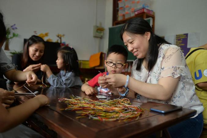 ▲小朋友和家长在山东聊城海源阁编制五彩绳。新华社发(孔晓政摄)丰子恺在《端午忆旧》中说小时候家乡过端午节很隆重:大姐“一月前头就制‘老虎头’,预备这一天给自家及亲戚家的儿童佩带”;染坊店里的伙计祁官,“端午的早晨忙于制造蒲剑:向野塘采许多蒲叶来,选取最像宝剑的叶,加以剑柄,预备正午时和桃叶一并挂在每个人的床上”;母亲“忙于‘打蚊烟’和捉蜘蛛:向药店买一大包苍术白芷来,放在火炉里,教它发出香气,拿到每间房屋里去熏……到了正午,又把一包雄黄放在一大碗绍兴酒里,调匀了,叫祁官拿到每间屋的角落里去,用口来喷。喷剩的浓雄黄,用指蘸了,在每一扇门上写王字;又在每个孩子的额上写王字;又用指捞一点来塞在每一个孩子的肚脐眼里。”