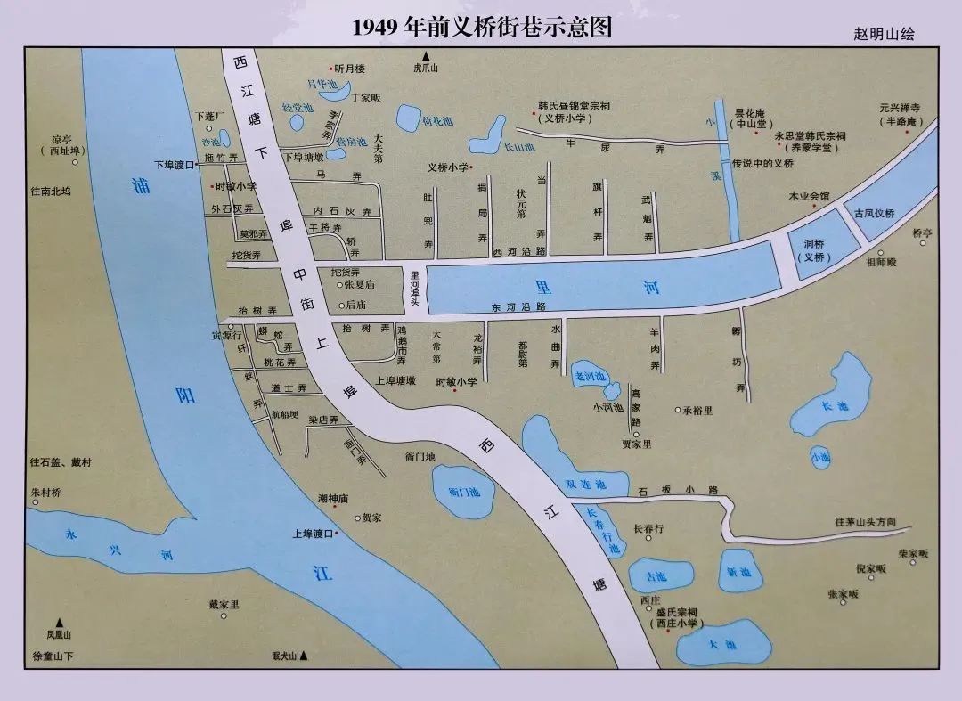 义桥老街地处浦阳江东岸,是一条由北向南的直街,依西江塘堤而建,老街分为上埠和下埠,街道两边有一条条弄堂横伸两端,那形状有点类似于甲鱼壳。与喧哗的集镇商城相比,这里略显宁静,偶有零星的叫卖声。当年的老街,沿街是一溜儿摆开的南北百杂、被褥衣裤、草席凉鞋、渔具渔网、锅碗瓢盆、针头线脑,还有剃头的、卖药的、拔牙的、卜易的、补鞋的、修锁的……可谓是一应俱全。