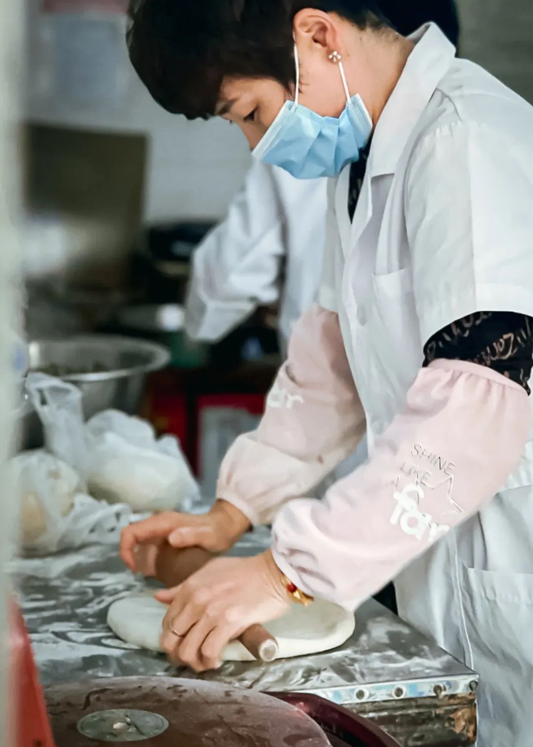 塘头麦饼的年头更长,它在瓯北东大街开了32年从未搬过。塘头麦饼坚持用古法制作,炭火烤制,传承最纯正的麦饼味道。