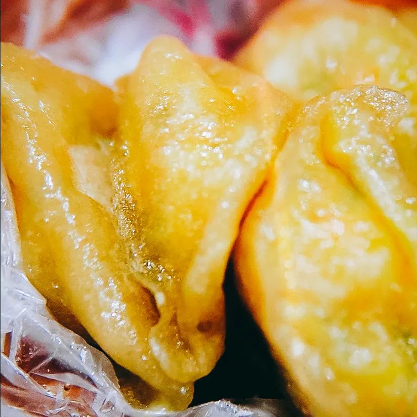 金粉饺是按斤卖的。大众点评博主Vicky告诉我们:“这家店是岩头超有名的一家金粉饺,小小的一间店铺就位于菜场口的巷子里,店里不能堂吃只能打包带走。”去年的价格是23元一斤,他买了30块钱,大约有13个左右。