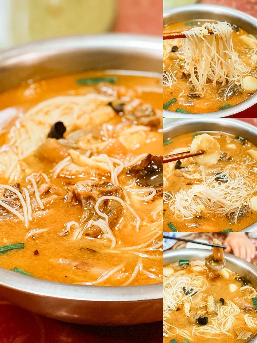 端上桌的本地鸡煮粉干,面上飘着薄薄的黄油,入口皮爽肉滑,香味浓郁,煮在其中的粉干吸收一部分的鸡汤,但又不失爽滑和Q弹。