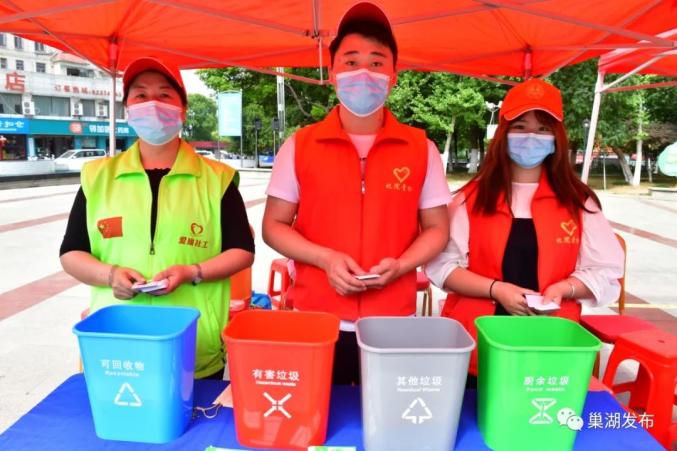 在合肥市巢湖市生态环境分局设立的垃圾分类宣传台前,工作人员与市民开展垃圾分类小游戏,通过发放标有不同垃圾名称的卡片,引导市民正确区分“有害垃圾”“厨余垃圾”“可回收物”“其他垃圾”;在巢湖市农业农村局宣传咨询台前,工作人员向市民散发“禁限农药名录”“外来入侵生活灭毒除害行动”“如何购买放心种子”等宣传资料。