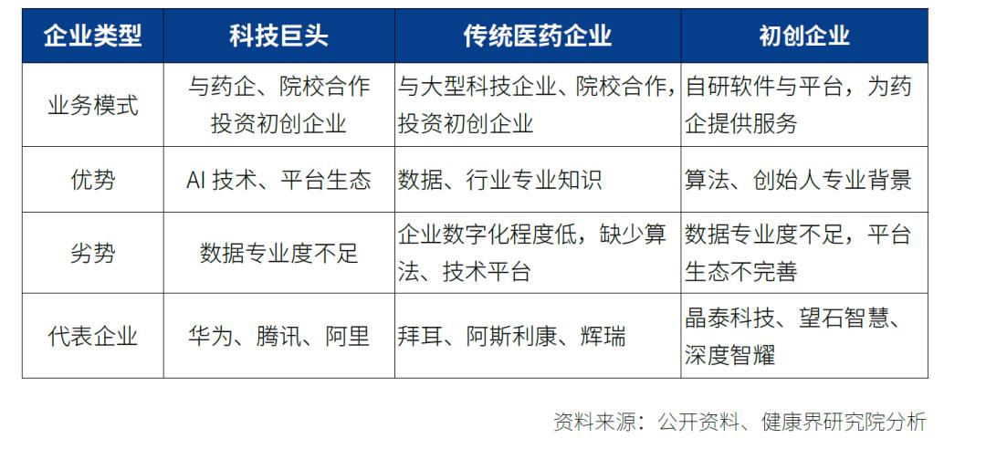 目前,AI药物研发市场有三大类公司,IT巨头、AI药物研发初创企业和大型药企。三类企业依托各自在平台、算法和数据的优势切入行业。