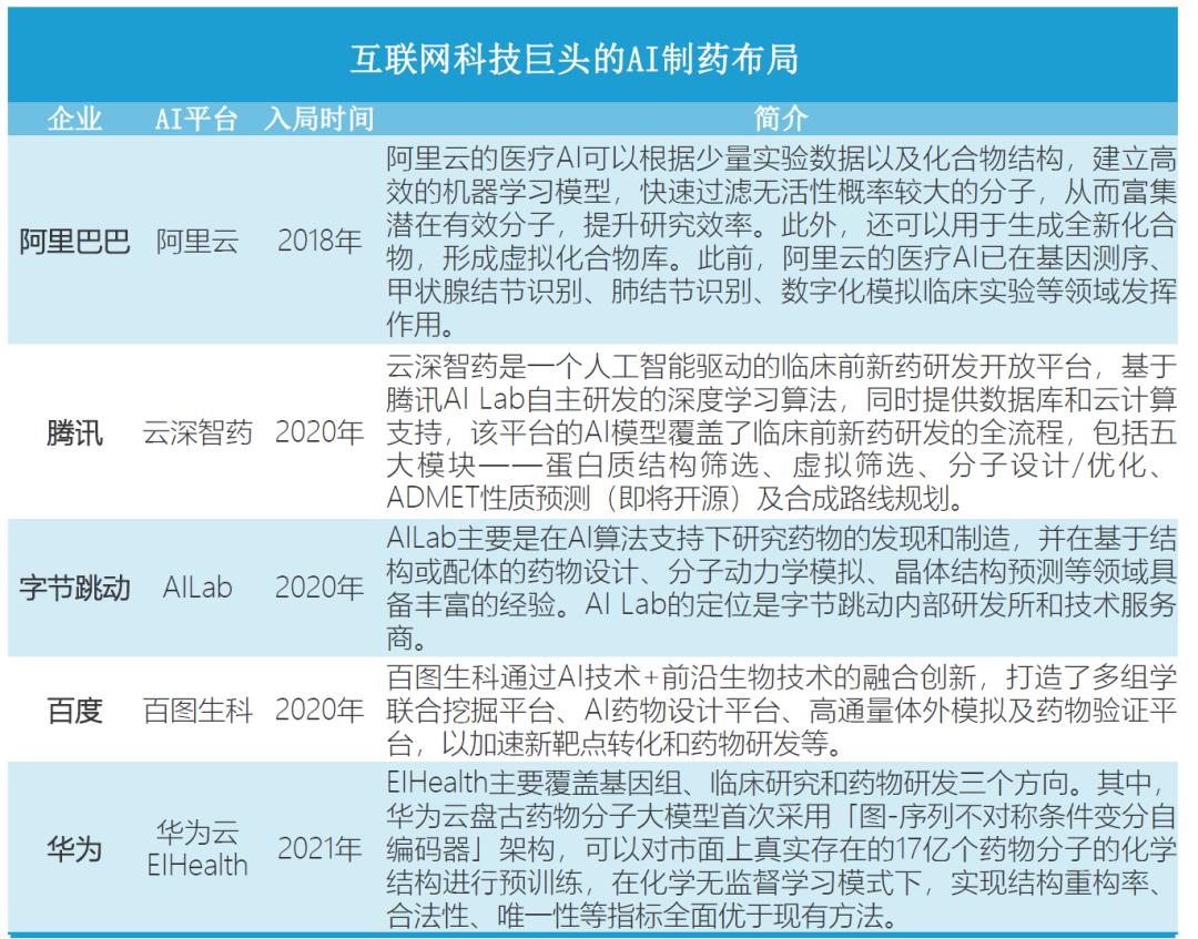 图:国内公司与AI公司合作情况 来源:健康界研究院IT公司这边,从2018年开始,阿里、腾讯等巨头都开始相继布局此赛道。主要发力方向是利用公司算力和AI模型的优势,介入到AI制药的环节中。