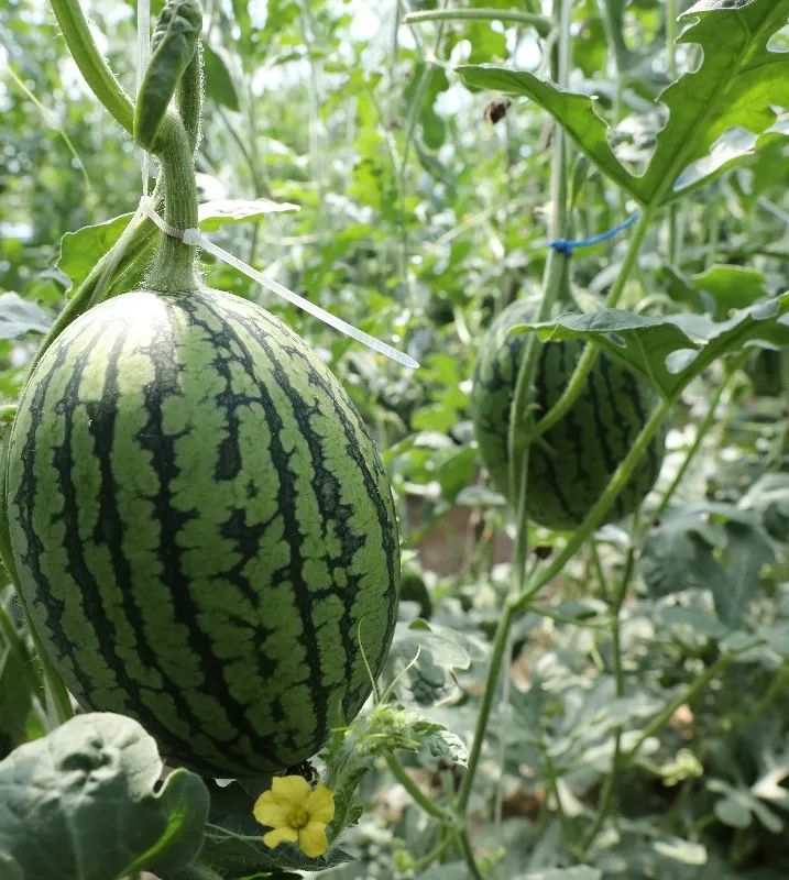 在下伍旗镇河各庄村的西瓜大棚内,顺着绿油油的瓜叶和千丝万缕的瓜藤向里寻去,就能看见藏在叶片中的小西瓜。