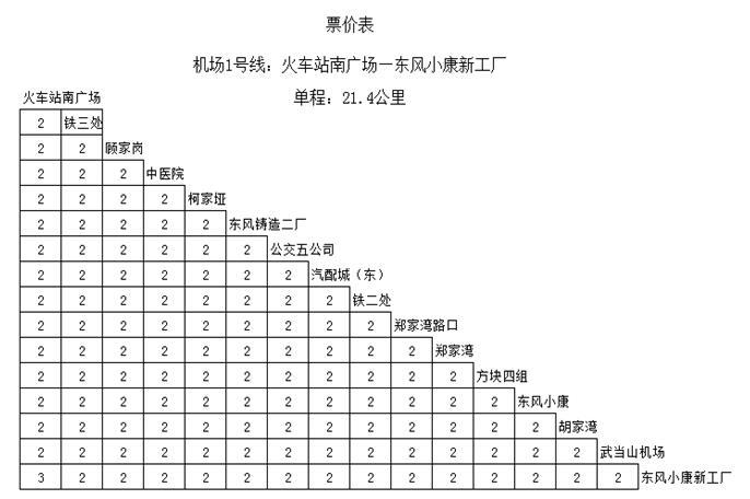 公交站点(16个):火车站南广场、铁三处、顾家岗、中医院、柯家垭、东风铸造二厂、公交五公司、汽配城(东)、铁二处、郑家湾路口、郑家湾、方块四组、东风小康、胡家湾、武当山机场、东风小康新工厂